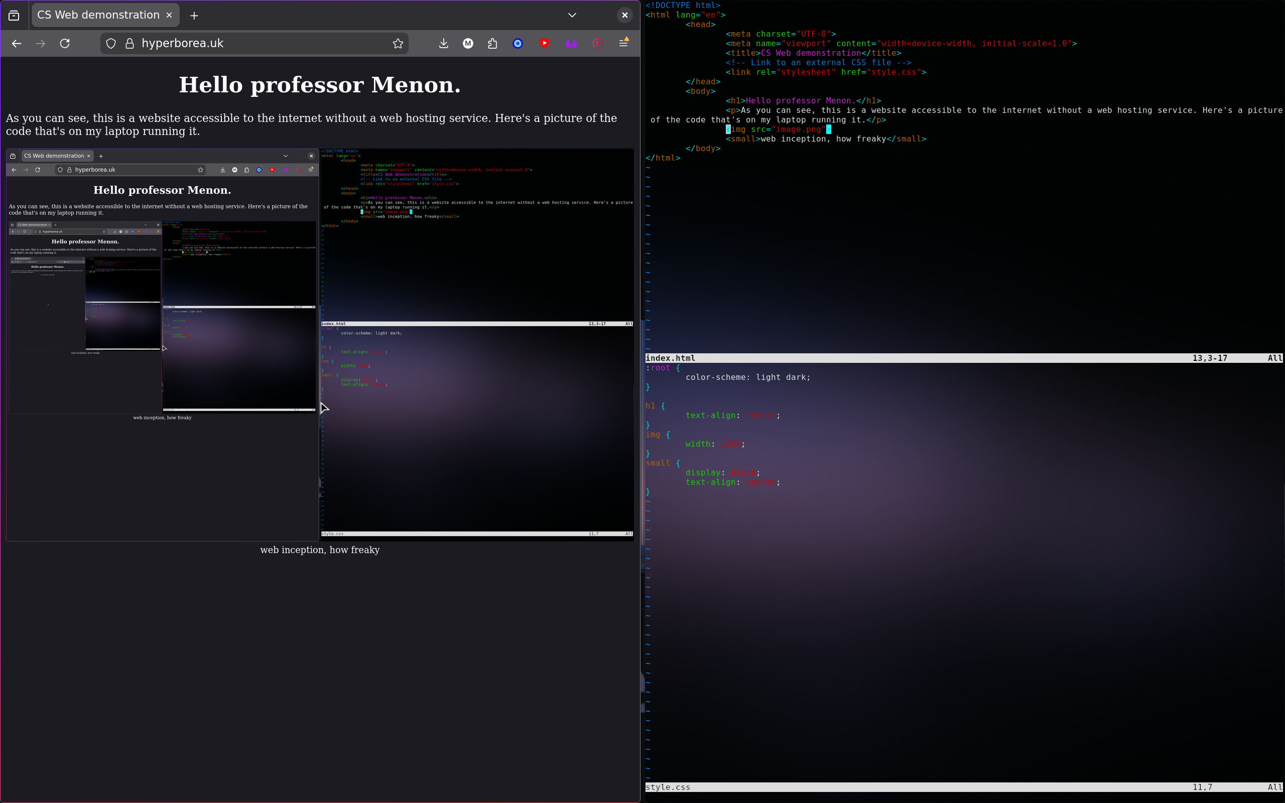As you can see, this is a website accessible to the internet without a web hosting service. Here's a picture of the code that's on my laptop running it.